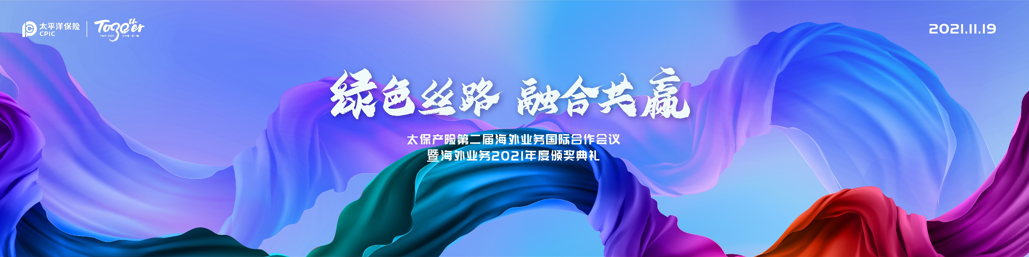 主視覺設(shè)計(jì)通過絲帶元素象征“一帶一路”戰(zhàn)略,寓意品牌與合作方相互聯(lián)結(jié)、共創(chuàng)美好思想。藍(lán)色為主體配色貼合品牌色彩,彰顯高端與商務(wù)屬性。